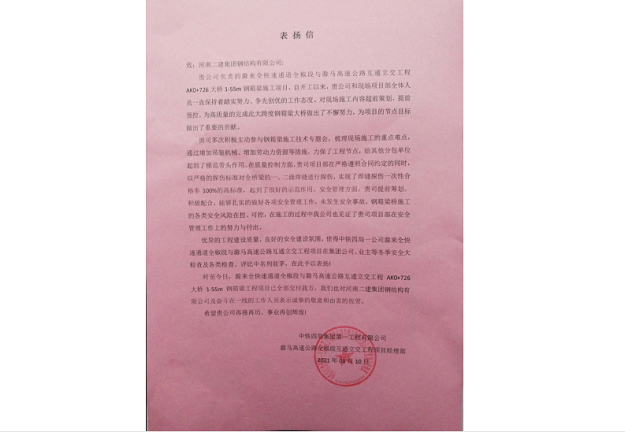 中铁四局集团第一工程有限公司向好博官方网页版_好博(中国)发来表扬信